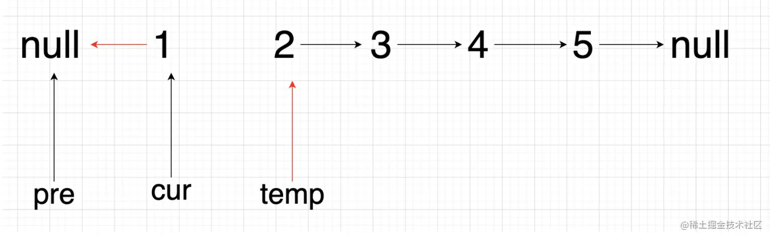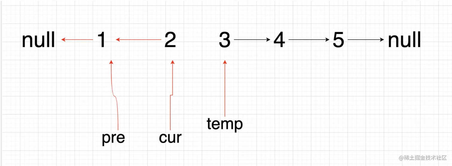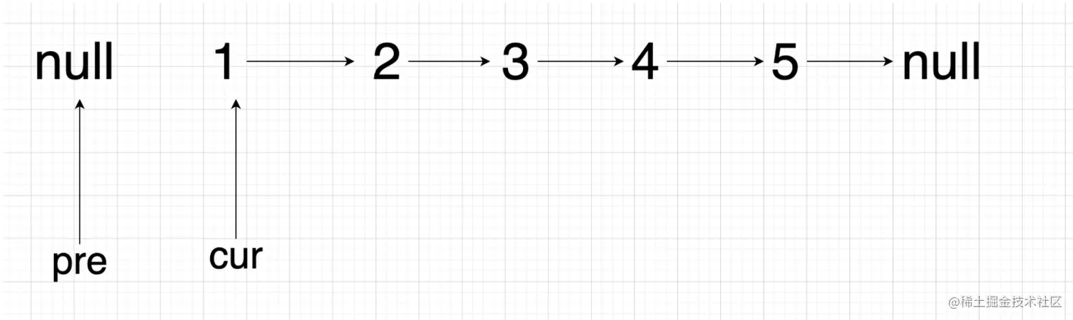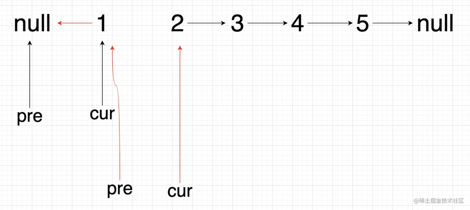 cur.next = pre; // 改变当前节点的指向为前一个节点