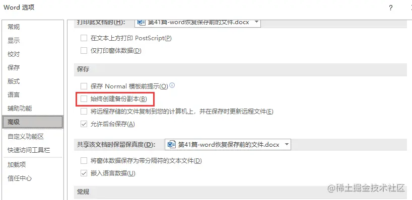 操作步骤:依次单击【文件】【选项】【高级】,找到【保存】,单击【始终创建副本】。