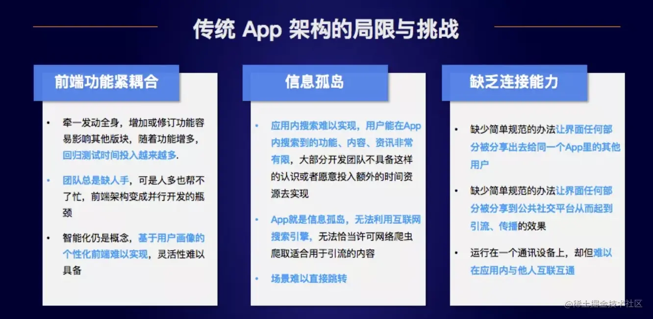 首先看一下目前我们传统的 App 架构面临的一个极限与挑战。当我们自己去开发构建一个 App,几乎都会遇到这样几个困惑,比如说我们要去升级一个功能、开发一个功能模块的时候,一般都会影响到整个 App 的使用,又比如当我们只想做一个很小功能点的改进,但是与此同时往往其他模块也都会受影响, 另外在开发过程中我们还会发现研发团队人手经常不够用,总是需要补缺。