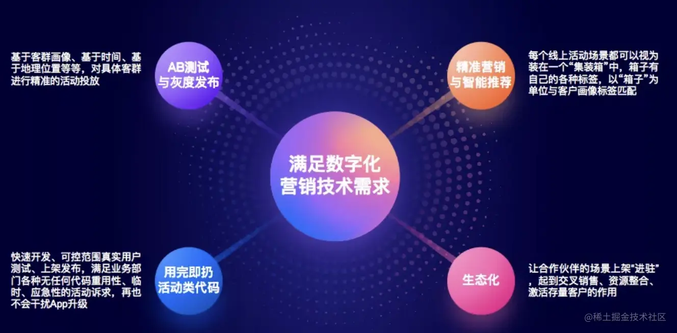 那除了上述这些体验和需求之外,开发者还要尽量满足数字化时代的业务团队人员的营销功能的需求。 比如说我们在 App 快速上架一个活动的时候,其实经常要做 AB test,还有灰度发布,类似的场景例如我们上新上线一个功能,可以让部分的人先用起来测试应用的版本有没有问题。