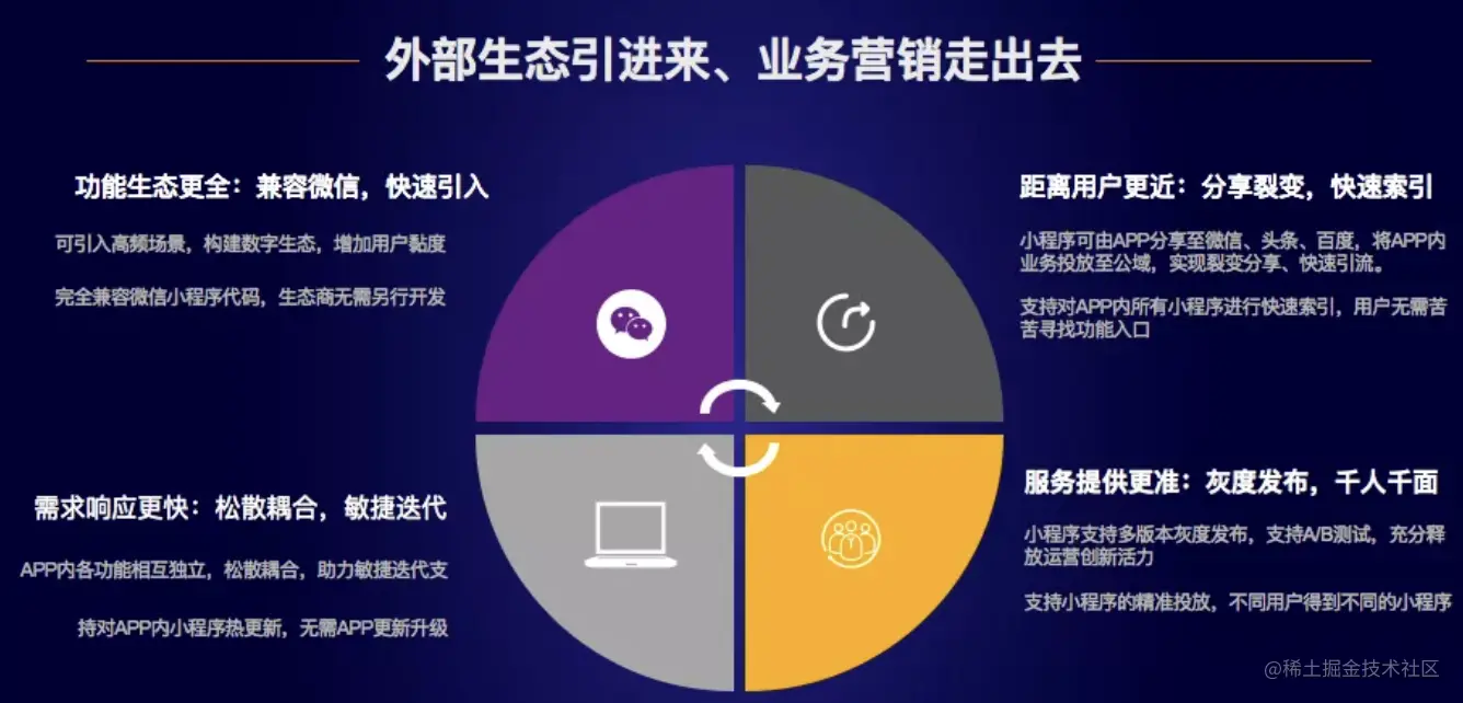 涉及到数字化营销,这里还有一个很重要的点要讲,那就是营销活动或者创意的快速上架,以及用完即扔的极致体验。 大概场景类似于:我们计划在 App 内做一个营销活动,业务人员上午给开发团队提出需求,希望下午研发运维人员就可以把这个营销活动的需求的功能给做完,然后直接在 App 里上线。小程序功能的普及让这种活动类或者营销类的需求可以真正实现当天需求当天解决。 最后,我还想提一下小程序为客户的 App 所带来的大厂生态的引入,即小程序可以通过开通接口的能力实现与大厂资源的无缝对接。