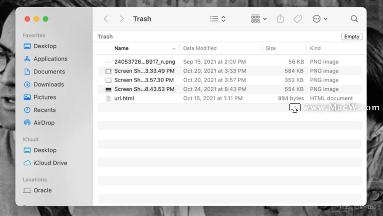 也可能会有其他的原因,但解决的错误代码是一样的:按住选项键盘上键,同时点击清空回收站按钮回收站。这将强制清空垃圾箱,并删除您无法解锁的所有锁定文件。
