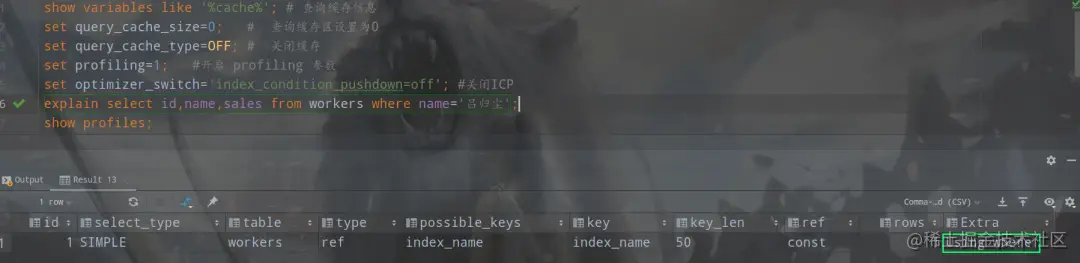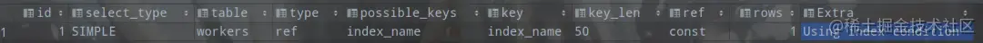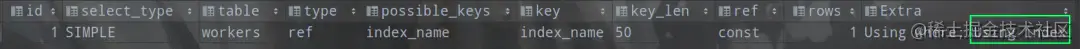 使用 explain 查看此条 SQL 的执行计划执行计划的 Extra 字段中出现了 Using where;Using index 表明查询触发了索引 index_name 的索引覆盖,且对索引做了 where 筛选,这里不需要回表。