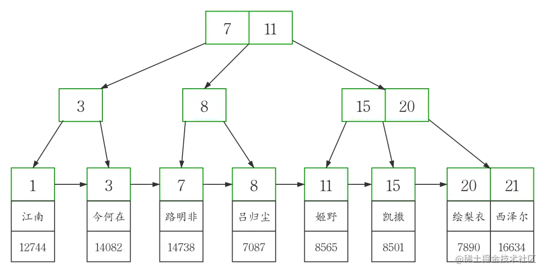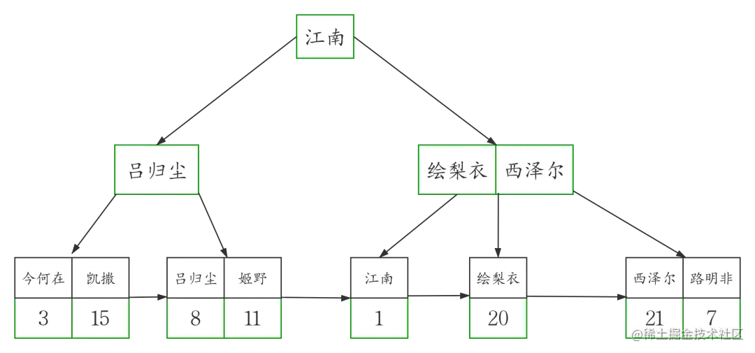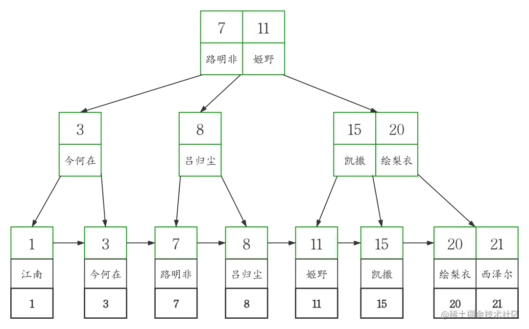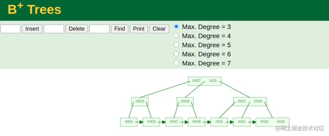这两张示意图中 B+tree 的度设置为了 3 ,这也主要是为了方便演示。