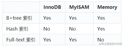 下表是 MySQL 常见的存储引擎 InnoDB,MyISAM 和 Memory 分别支持的索引类型