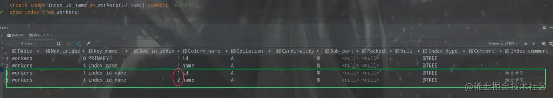 演示一下联合索引create index index_id_name on workers(id,name) comment '组合索引';这条语句在我们演示表 workers 中建立 id,name 这两个字段的联合索引。借助 show index 命令查看索引的详细信息 操作后结果如下: