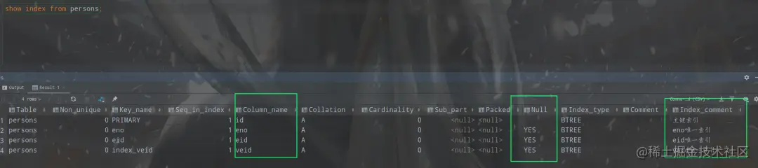 通过 show index from persons;命令我们看到已经成功创建了三个唯一索引。