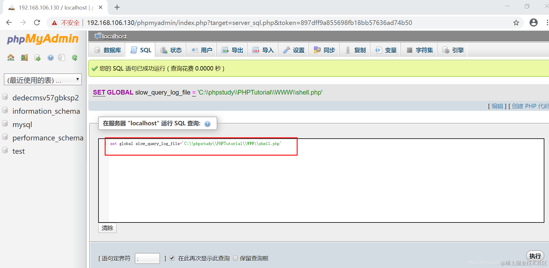 修改slow_query_log_file日志文件的绝对路径以及文件名为C:\phpstudy\PHPTutorial\WWW\shell.php