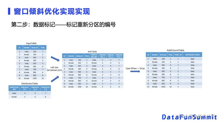 第二步是数据标记,拿到数据分布表以后就可以对数据打标记,这里使用的Join,做一个拼表的操作。把它加进去根据每一个数据针对它的PERCENTILE做分析。比如说男和女的数据,均匀分成四份,每一行和几个百分比值做比较,第一条分到第一个块,后面数据分别分到第二、第三、第四个块。有了新增的添加列,我知道每一行数据是第几块以后,就可以对每一块数据做扩充了。