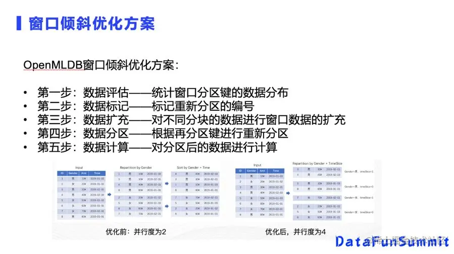 OpenMLDB的解决方案是通过四步来实现。从最终的结果优化可以看到,优化前是并行度为2,优化后并行度为4,至少可以提升一倍。
