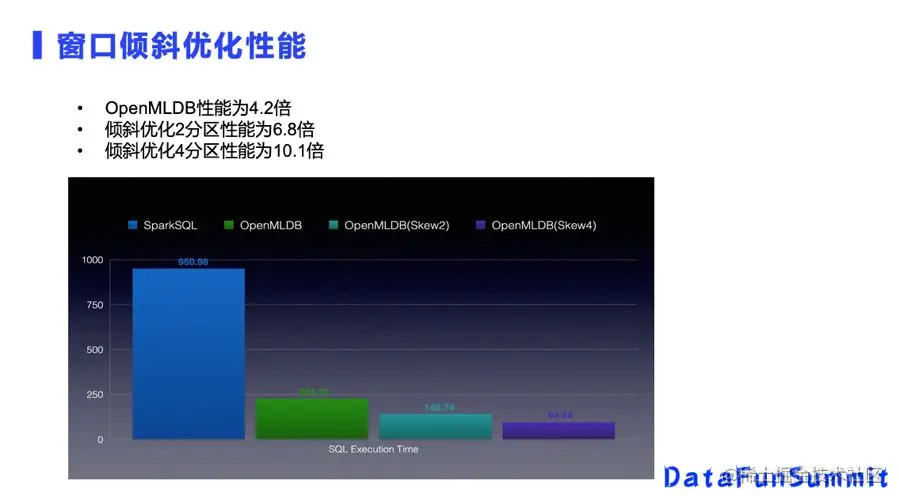 经过窗口倾斜优化后,OpenMLDB对比了最新版本的SparkSQL,本身OpenMLDB相比Spark就已经有四倍的性能提升了。加上倾斜优化以后,相比Spark的倍数提升更多,相比于没有倾斜优化,提升也比较明显。此外,倾斜优化资源越多的话,性能提升也会更加明显。