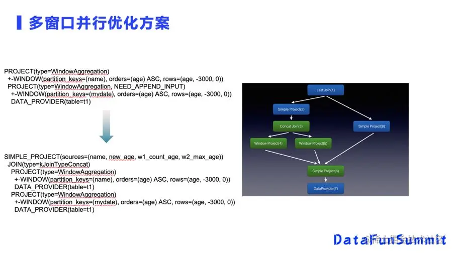 这种并行是怎么实现的呢?前面用户经过我们的SQL parser编译,可以得到一个优化后的逻辑计划。最底层是一个DataProvider节点,优化后是一个并行的结构。我们执行的时候先把需要的数据取出来,然后再做第二个WindowAgg,它们之间并没有互相依赖,数据也不需要读两份,而是都依赖于DATA PROVIDER节点。为了实现并行窗口数据的合并,需要再加一个JOIN节点。前面的简单列筛选节点,本身没有性能消耗,只是在逻辑计划里表示我计算时需要输入哪些列,在实际计算的时候,它不需要对整行数据进行编解码和传输。
