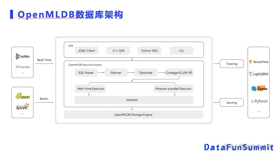 OpenMLDB的左边是一些外围系统,支持数据引入,它的外层用户有JDBC或者Pytho SDK等编程接口,底层是自研实现的SQL Parser,也包含自定义的一些Optimizer,后端实现了基于LLVM的执行引擎,它可以针对不同的硬件做优化,比如说X86、ARM架构等,以后也可以基于LLVM PTX后端实现GPU硬件加速。