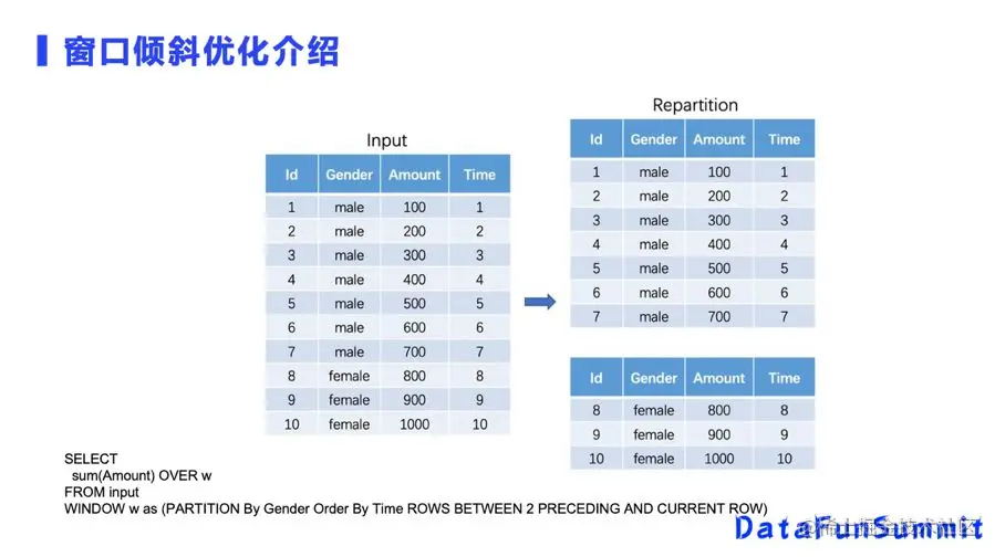 这是一个窗口倾斜的典型场景,在我们的训练数据里面,数据只有两个性别,男和女。在这个场景下,我们对男和女做一个Window特征的话,分区键只有两个值,实际上只有两个分区。也就是说这一个SQL场景,我们基于分区键来做聚合,实现上只会有两个分区,无论你的Hadoop集群有一百还是一千CPU,Spark任务只能分成两个Task去处理,整个任务耗时就在倾斜分区上了。
