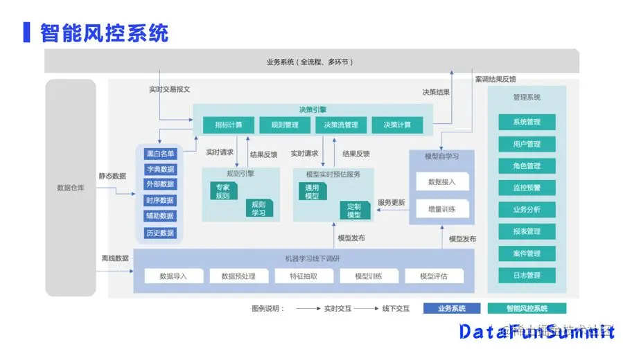 这是一套完整的智能风控系统,我们今天介绍的是OpenMLDB在这套系统里最底层的离线数据管理以及在线的特征查询服务。