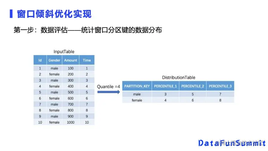 第一步是数据评估,首先统计一下这个数据是否有数据倾斜,假设有数据需要重新分区,我们把每个数据重新分成多块,这个例子就是先统计知道这四块里面在20%、50%、70%的数据是什么,然后可以把数据均匀分成多块,每一块的数据量都是接近的。而计算每一块的25%是多少,需要全量的数据统计,这里可以做一个近似的查询,查询到每一个数据的排序键25%的位置的值是多少就可以,近似计算性能也比全量统计好很多。