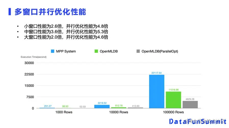 并行优化性能如图所示,这里罗列了三个性能测试场景,和最新的MPP System进行对比,基于窗口并行优化后的OpenMLDB与开源MPP系统性能可以是原来的5.3倍,相比OpenMLDB本身性能也在2倍左右。