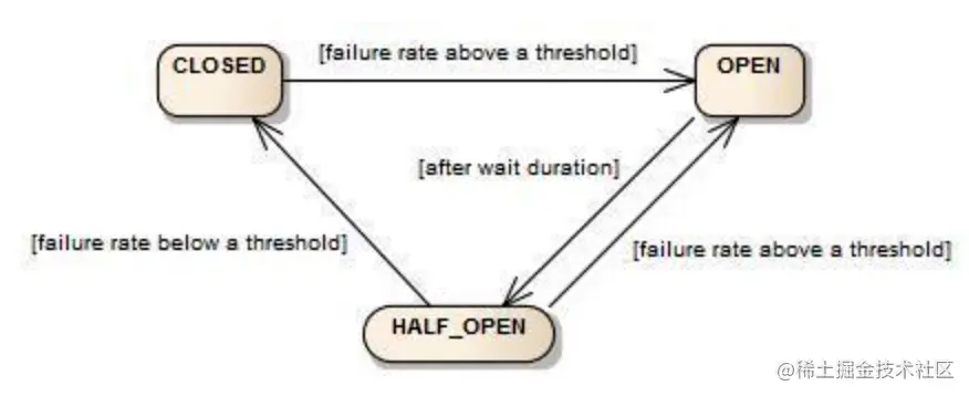 当经过一段时间后,熔断器会从打开状态转换到半开状态,这时仅有一定数量的请求会被放入,并重新计算失败率,如果失败率超过阈值,则变为打开状态,如果失败率低于阈值,则变为关闭状态。