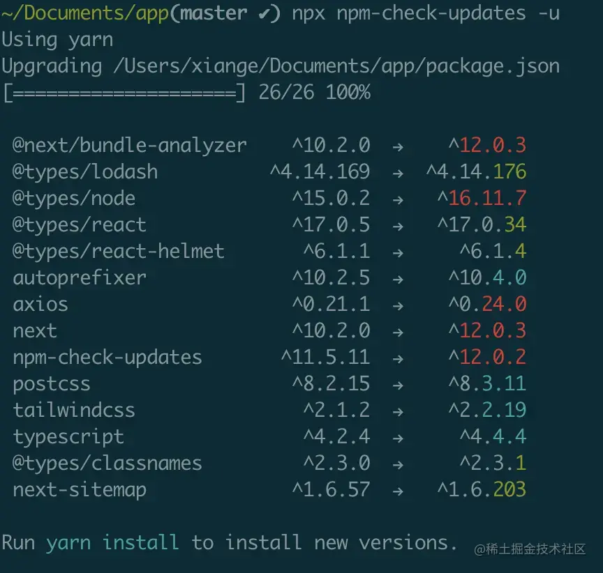 npm-check-updates -u,可自动将 package.json 中待更新版本号进行重写。