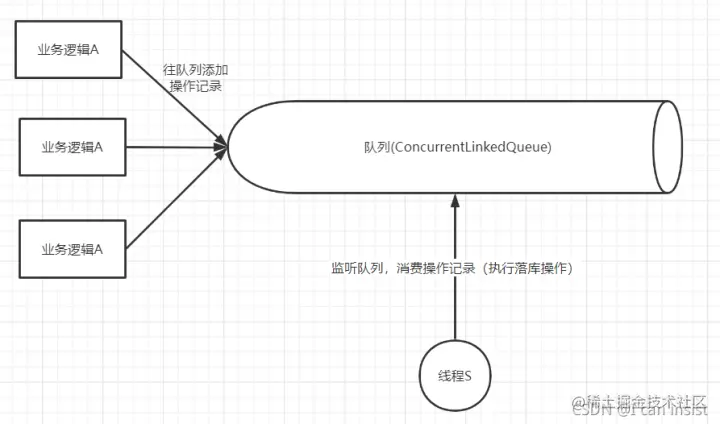 说到异步大家肯定就有思路了。接下来,先给大家上个图,大家第一反应可能是——这不就是MQ嘛。没错,这个思路跟MQ的实现有异曲同工之妙,可以说是基础版的MQ了。