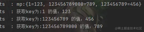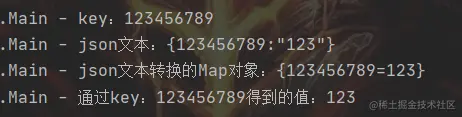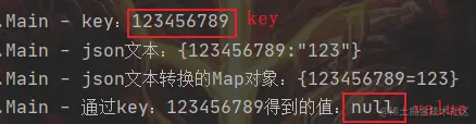 Long l = 123456789L;public class Main { public static void main(String[] args) throws Exception { //A服务的数据 Map<Long,String> mp = new HashMap<>(); Long l = 123456789L; mp.put(l,"123"); // B服务通过网络请求得到A服务的响应文本 String s1 = JSON.toJSONString(mp); log.info("json文本:{}",s1); // 将文本转换成Map对象 Map<Long,String> mp2 = JSON.parseObject(s1,Map.class); log.info("json文本转换的Map对象:{}",mp2); // 通过key取值 log.info("通过key:{}得到的值:{}",l,mp2.get(l)); } }运行结果