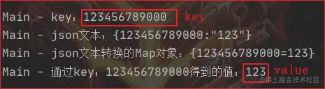 Long l = 123456789000L;,代码如下:@Slf4j public class Main { public static void main(String[] args) throws Exception { //A服务的数据 Map<Long,String> mp = new HashMap<>(); Long l = 123456789000L; mp.put(l,"123"); log.info("key:{}",l); // B服务通过网络请求得到A服务的响应文本 String s1 = JSON.toJSONString(mp); log.info("json文本:{}",s1); // 将文本转换成Map对象 Map<Long,String> mp2 = JSON.parseObject(s1,Map.class); log.info("json文本转换的Map对象:{}",mp2); // 通过key取值 log.info("通过key:{}得到的值:{}",l,mp2.get(l)); } }运行结果