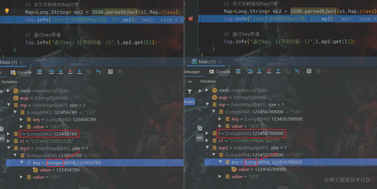 一看这两种情况下mp2对应key的类型(上图箭头部分),应该就明白,为什么key是 long l = 123456789l的时候,mp2取不到值了吧;因为转换后mp2里面存的压根儿就不是Long型的key,而是一个Integer的key?当Key是Long型的时候,就能正常取到值,当为Integer的时候,取出来的就是null