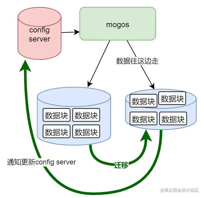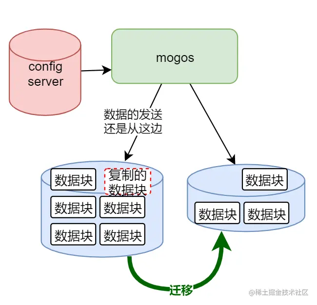 当搬迁完毕之后,相应数据块所在的分片就会通知 config server 更新配置,且原来复制的副本也会被删掉,此处 mogos 发送的数据,就会往新的一边进行发送