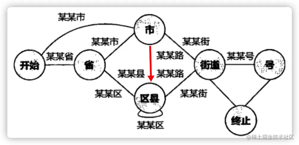 每一个有限状态机都有一个开始状态和一个终止状态,以及若干中间状态,没一条弧上带着一个状态进入下一个状态的条件,比如在上图中当前的状态如果是省,如果遇到下一个词组和区有关就进入区,如果遇到下一个词组和城市有关那么就进入市。
