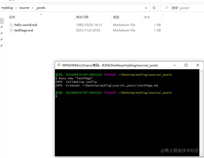 - 可以在当前文章目录下执行命令hexo new "你的文章名字",就会自动创建新文章,默认md格式