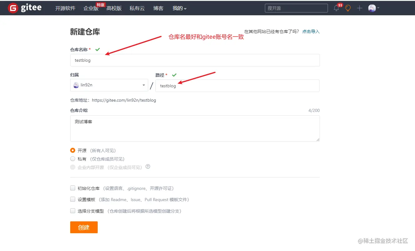 - 为仓库起个名字,最好和账号名保持一致,由于我已经创建了同名仓库,所以这里换一个名字,然后下面选择开源,所有人可见