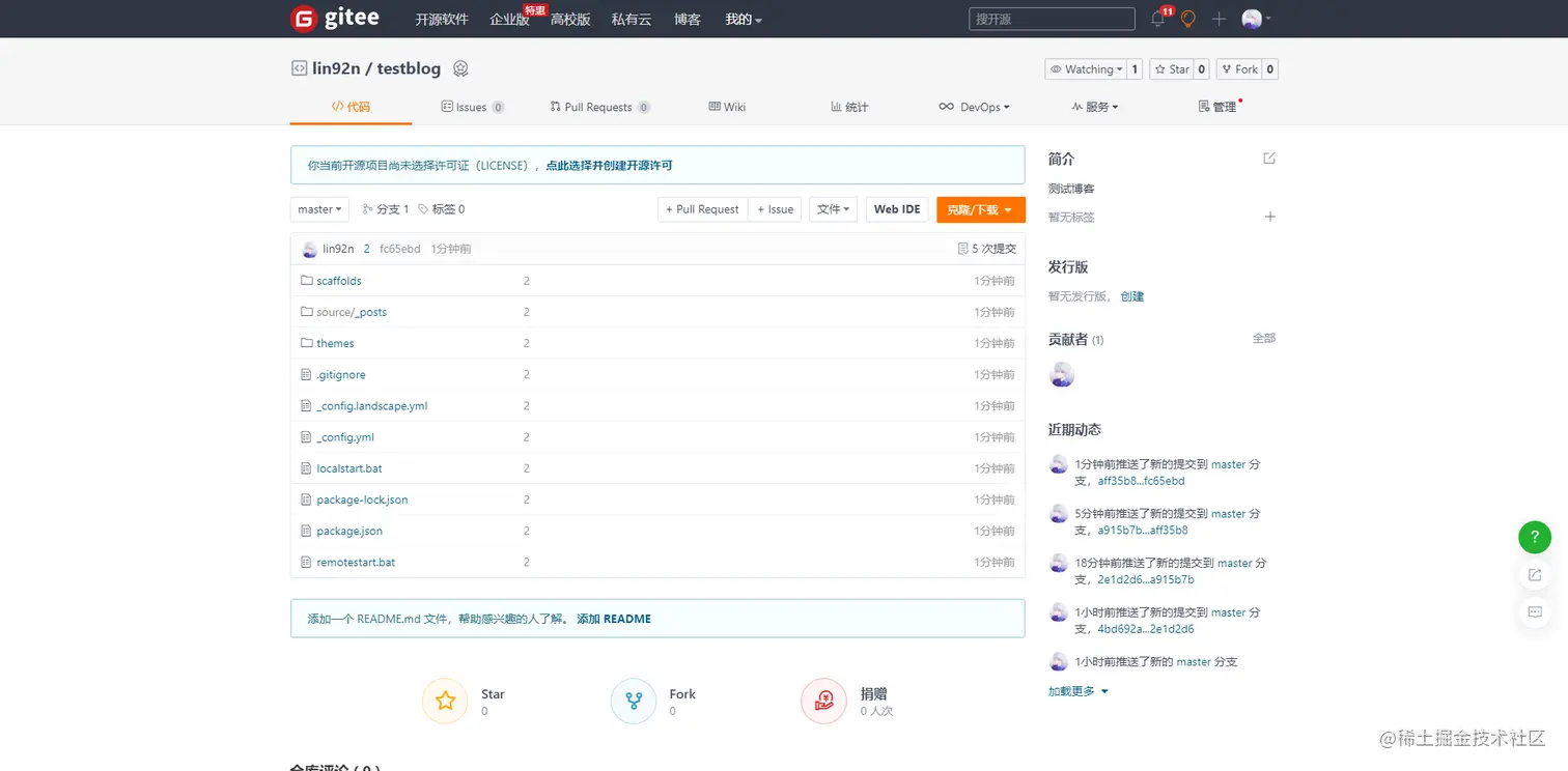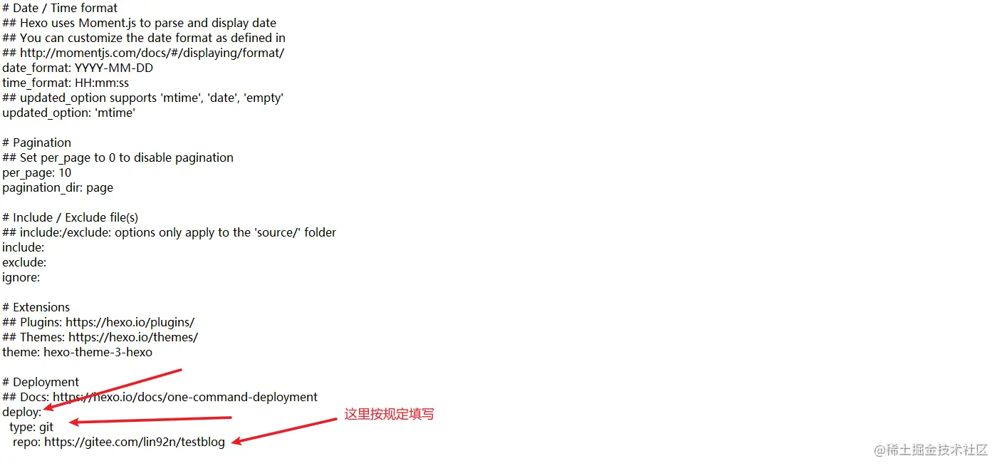 deploy: **type: git **repo: gitee.com/用户名/仓库名 #仓库的地址,比如我的就是:gitee.com/lin92n/test… branch: master