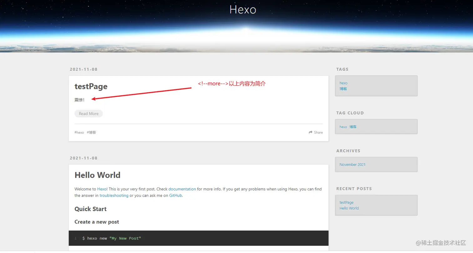 <!--more-->,上面的内容是文章的简介,下面是正文部分