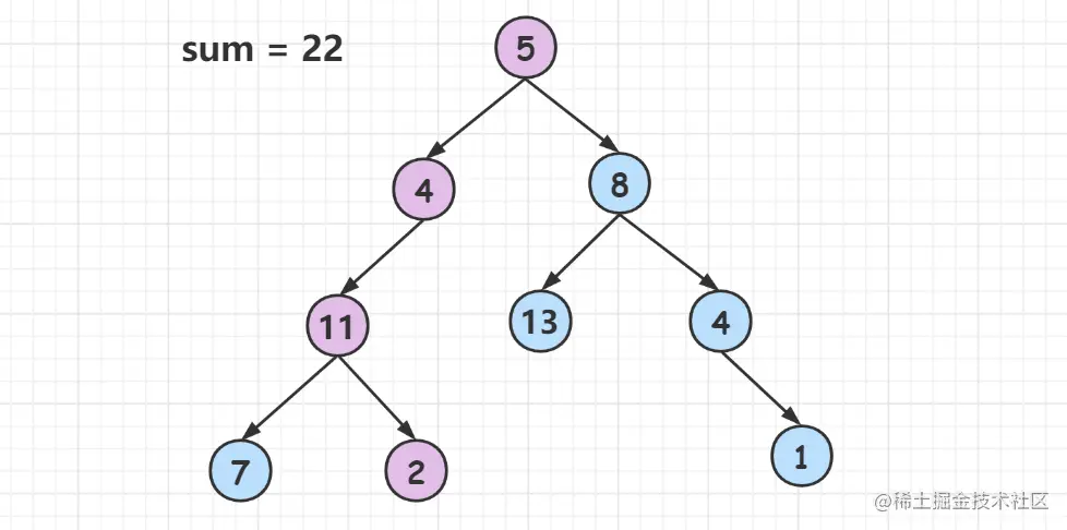 如样例所示,存在[5, 4, 11 , 2] 这样一条路径,其相加之和等于sum。下面来讲解递归的做法。
