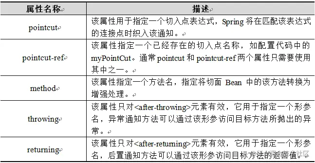 使用< aop:aspect>的子元素可以配置5种常用通知,这5个子元素不支持使用子元素,但在使用时可以指定一些属性,其常用属性及其描述如下: