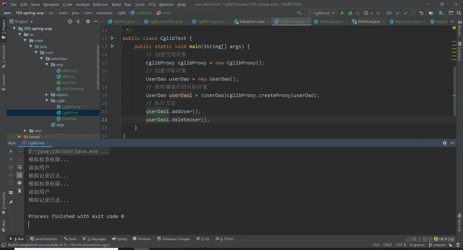 CGLIB(Code Generation Library)是一个高性能开源的代码生成包,它采用非常底层的字节码技术,对指定的目标类生成一个子类,并对子类进行增强。