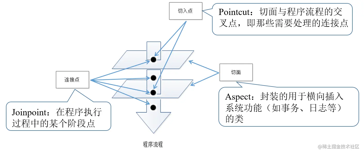 为了解决这一问题,AOP思想随之产生。AOP采取横向抽取机制,将分散在各个方法中的重复代码提取出来,然后在程序编译或运行时,再将这些提取出来的代码应用到需要执行的地方。这种采用横向抽取机制的方式,采用传统的OOP思想显然是无法办到的,因为OOP只能实现父子关系的纵向的重用。虽然AOP是一种新的编程思想,但却不是OOP的替代品,它只是OOP的延伸和补充。