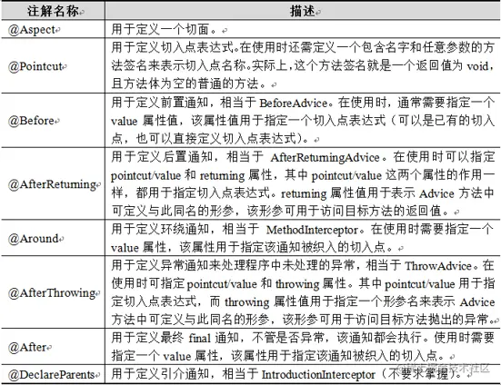 AspectJ框架为AOP的实现提供了一套注解,用以取代Spring配置文件中为实现AOP功能所配置的臃肿代码。AspectJ的注解及其描述如下所示: