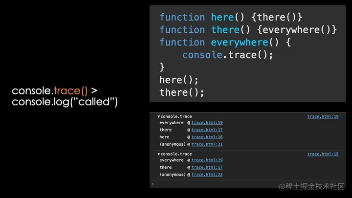 通常我们可能会添加“console.log(‘Called’)”或者类似的表达来测试某项功能是否被触发。在得到肯定的答案后,接下来当然是找出调用该方法的根源。这时候就该“console.trace()”大显身手了,它不仅能告诉我们哪些东西被调用过、还能告诉我们调用操作来自何处。