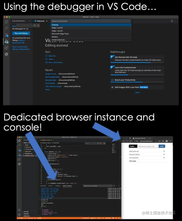 在 Visual Studio Code 中启动调试会话时,我们可以生成一个浏览器实例,并通过开浏览器开发者工具将 Debug Console 作为 Console 使用。