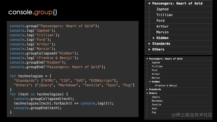 如果大家有很多消息需要记录,不妨使用“console.group(‘name’)”与“console.groupEnd(‘name’)”将消息打包至 Console 中的可折叠与可扩展消息内,甚至可以设置默认情况下使用扩展或者是折叠分组。