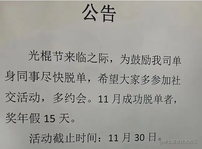 最近一个上海某自研公司老板就贴出土豪的“脱单公告”,光棍节要来了,为鼓励单身的能尽快脱单,只要11月 能成功脱单的,奖励15天的年假。这个老板真的任性呀,很多人在一间公司工作好几年,一年才几天的年假,只要能脱单就奖励15天的年假,实在太爽了。