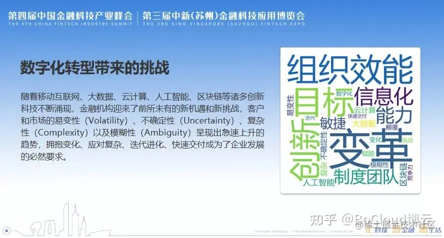 今天的分享包括四个部分,第一部分是整个建设背景。近年来整个金融企业,尤其是券商银行,提的较多的概念就是数字化转型,数字化转型面临了很大挑战,一方面对于新兴技术,尤其是创新技术,包括互联网、大数据、云计算,人工智能甚至区块链,本身发展就特别快,对研发要求比较高,随着研发技术逐步深入,业务发展对技术部门提出了更高要求,一方面是客户的需求一直在变化,另一部分是希望技术直接推动业务。原来我们一直在讲,业务引领技术赋能,现在更多讲的是怎么推动整个业务发展,所以从这张图可以看到,我们当时去摘录金融机构做数字化转型相关文章的关键字,出现最大的是组织效能,怎么做变革、怎么做创新,对 IT 人员来说是比较高的挑战。