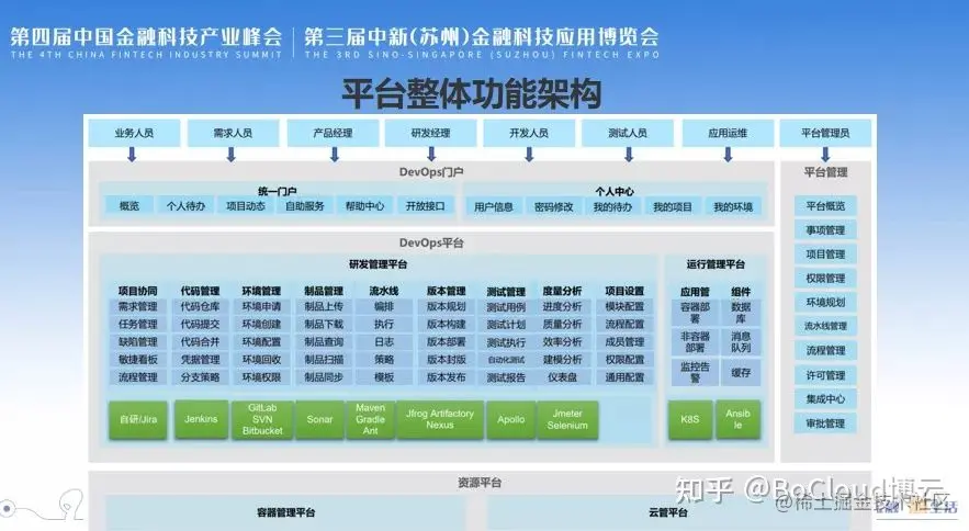 从底向上看,我们之前跟博云合作过其它的一些技术,从底我们做相关资源的平台整合,或者是去做应用。往上看从左到右,几乎是整个研发的全过程,这里不类举了,每一个点都非常多,包括怎么管代码、怎么管需求、怎么流水线、流水线出来之后度量怎么分析。一个研发团队,站在我的角度来说,我很关心比如说现在有50个研发项目组,怎么看代码好坏、研发是不是达到既定的目标、怎么看项目进度、原有的软件图是否能满足我们要求,在做整个 DevOps 平台的时候,我们通过这种建设,能够在原有代码和项目的管理基础上,为所有的项目组提供相关的服务。