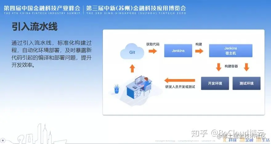 第三件事情是引入流水线 。我们希望每一件做的事情,都是按照既定的目标去做,我们还可以引入整个自动化环境部署、自动化测试,所有东西不应该是通过“人肉”的方式去做,引入流水线对于传统的研发人员挑战比较高,对于研发的接口测试、单元测试,都有比较高的要求,研发人员写完代码,可以直接上传到内部的 Git 代码仓库,我们通过触发器定时,或是根据事件的触发,对它进行代码抓取、构建,以及最后的发布,也是通过容器技术,可以快速部署整个开发环境、测试环境,甚至是生产环境,这边代码刚提交,那边就打包、编译、上传,甚至发布,Bug 越早发现,修改的成本就越小,如果在生产时已经部署了,再让客户发现对它进行追踪,其实效率就非常低了。