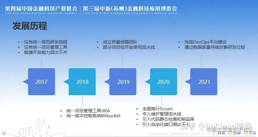一开始我们没有整个大的统一工具,2018年开始我们做了一个事情,整个东吴证券研发中心有两个部分,一个是苏州研发中心,还有一部分是上海研发中心,我们把两个研发中心的基础管理类工具全部做了统一,包括项目管理工具、代码库均做了统一,2019年专门成立了质量保障团队,跟传统的团队不太一样,除了承担原有测试团队的功能之外,对整个研发质量和流程做管控,部分项目使用流水线。从2020年的时候,全面推广 Scrum,双态流程越来越高,我们希望是在同一个体系支撑之下做的,我们全面开放 Scrum 流程,并且能够引入自动化工具,实现代码审查,实现一些接口自动化测试。