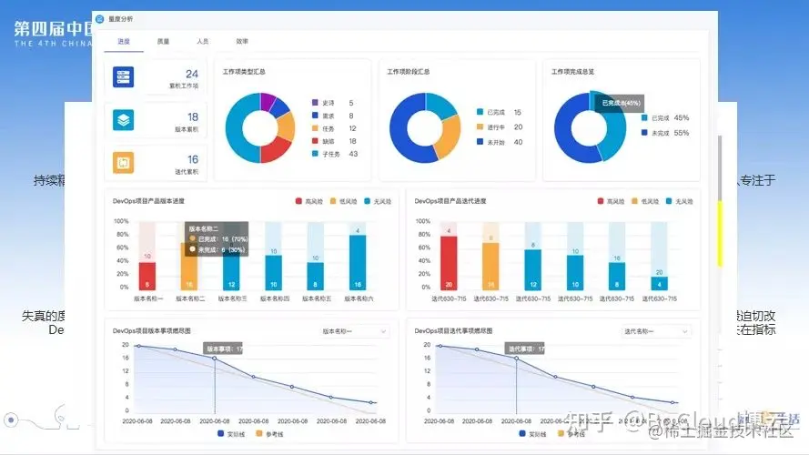 这是研发度量里面有指标做的截图,做度量指标的时候,并不是 KPI 和度量做绑定,而其实是作为一个改进的参数,让达到知道在工程维度有哪些地方做的不是特别好,项目维度哪个做的不好,整个开发的过程维度,整个团队的协调组织架构过程,以及交付过程中有哪些改进,比如说都是敏捷类开发的,互联网类的项目,我比其它的项目组有什么不同,这个可以做度量和提升的点,我们整体会出一个大的视图,让大家知道我整个度量维度是怎么样的,最后 Scrum 结束之后,有哪些必须要做改进,这个才是关键的点。