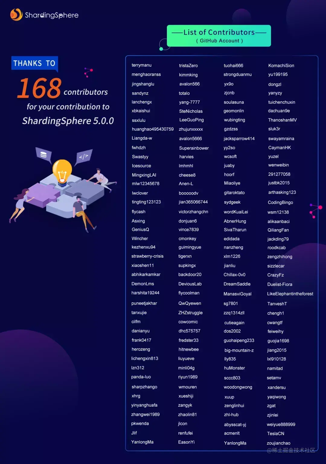 Apache ShardingSphere 5.0.0 版本的发布离不开社区用户的支持和贡献,期间共有 168 位 Contributor 提交了 4468 个 PR,助力 ShardingSphere 5.0.0 版本的全力发布,感谢社区伙伴们的大力支持。