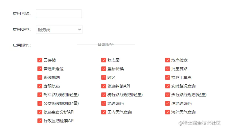 - 在申请地图key的页面,输入应用名称、应用部署的服务器ip、勾选需要的地图服务,然后生成个key
