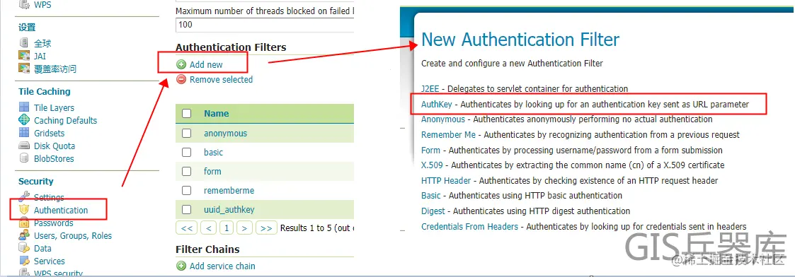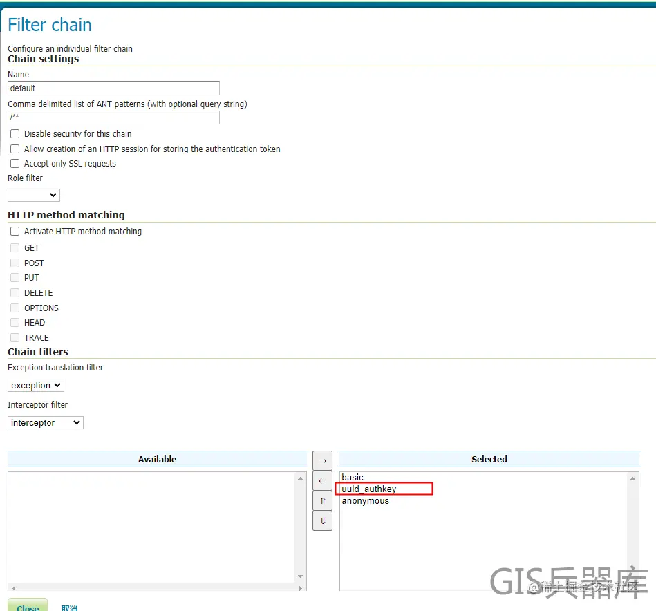 这一步其实就是通过界面来配置geoserver的拦截器,分两步,一是配置访问哪些地址时进行拦截,也就是配置拦截规则,二是配置拦截下来后验证key是否有效,也就是配置验证规则